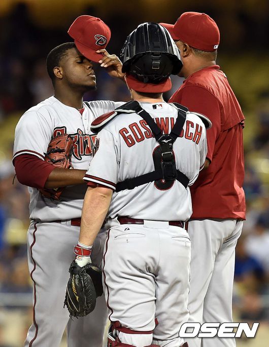 2회말 다저스 공격 무사 1, 2루 상황 애리조나 선발 루비 데 라 로사가 모자를 고쳐쓰고 있다.