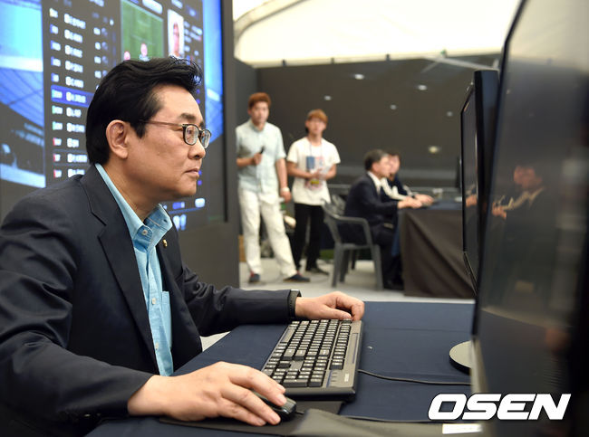 국제 e스포츠연맹 전병헌 회장이 피파온라인3를 체험하고 있다.