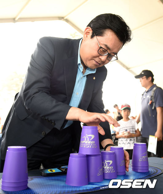 국제 e스포츠연맹 전병헌 회장이 스포츠 스태킹(컵쌓기)을 체험해보고 있다.