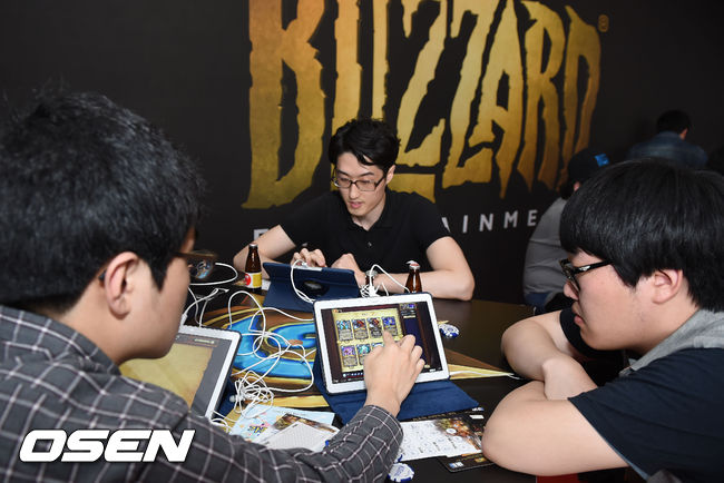 참가자들이 하스스톤 부스에서 하스스톤을 체험을 하고 있다.