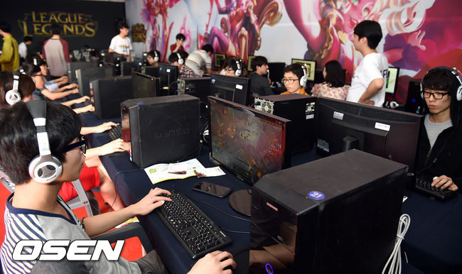리그 오브 레전드 부스에서 참가자들이 게임을 하고 있다.