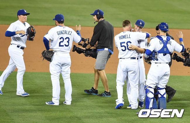 다저스 피더슨과 J.P 하웰을 비롯한 선수들이 하이파이브를 나누며 승리를 기뻐하고 있다./dreamer@osen.co.kr