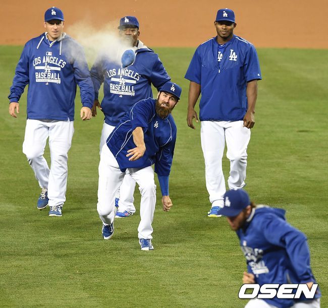 경기 종료 후 다저스 스캇 반 슬라이크와 클레이튼 커쇼가 장난을 치며 승리를 기뻐하고 있다./dreamer@osen.co.kr
