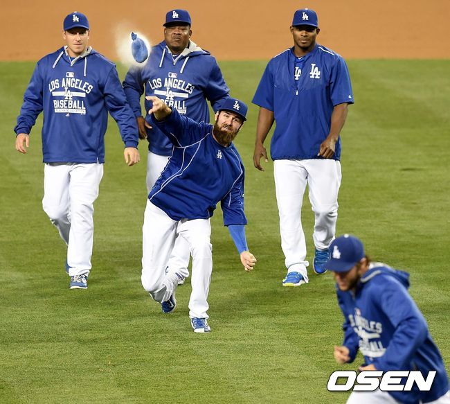 경기 종료 후 다저스 스캇 반슬라이크와 클레이튼 커쇼가 장난을 치며 승리를 기뻐하고 있다./dreamer@osen.co.kr
