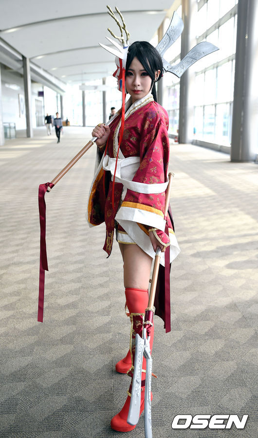 리그 오브 레전드 아칼리 분장을 한 팬이 포즈를 취하고 있다.