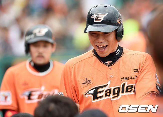 1회말 1사 3루에서 한화 최진행이 좌월 투런 홈런을 치고 더그아웃에서 동료들과 하이파이브를 하고 있다.