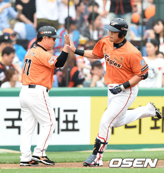 1회말 1사 3루에서 한화 최진행이 좌월 투런 홈런을 치고 김광수 코치와 하이파이브를 하고 있다.