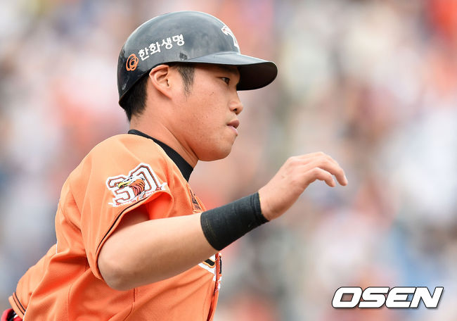 1회말 1사 3루에서 한화 최진행이 좌월 투런 홈런을 치고 그라운드를 달리고 있다.