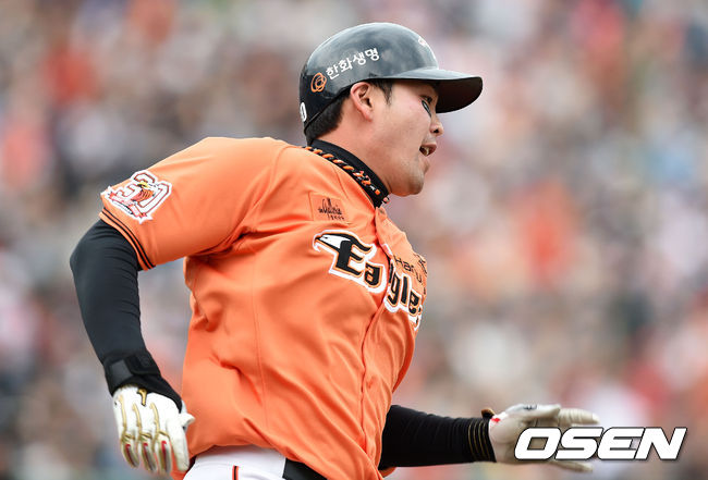 2회말 무사 1루에서 한화 김태완이 중전 적시 2루타를 치고 그라운드를 달리고 있다.