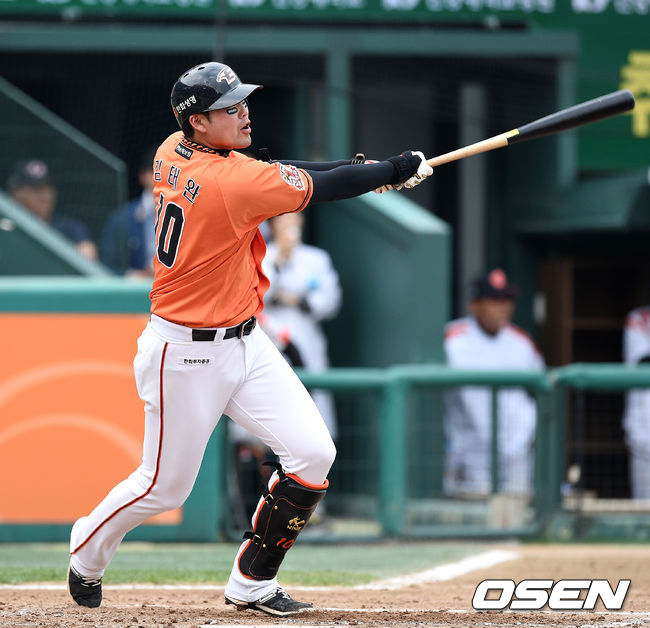 2회말 무사 1루에서 한화 김태완이 중전 적시 2루타를 치고 있다.