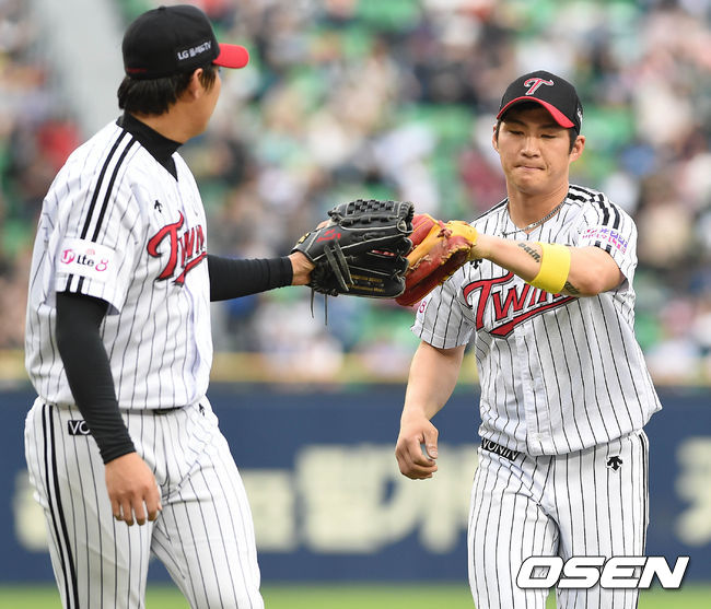 2일 오후 서울 잠실구장에서 열린 '2015 타이어뱅크 KBO 리그' LG 트윈스와 넥센 히어로즈의 경기 4회초 1사 1루 김민성을 병살로 처리한 장진용이 덕아웃으로 향하며 오지환과 하이파이브를 하고 있다.
