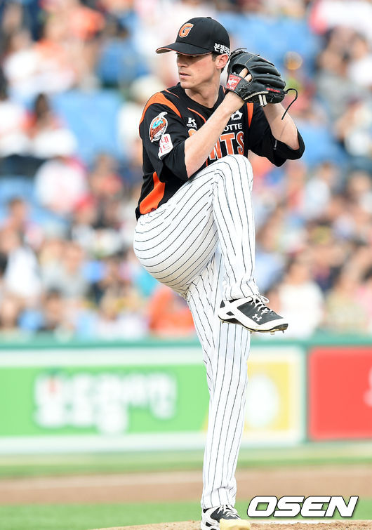 1회말 무사에서 롯데 선발투수 레일리가 힘차게 공을 던지고 있다.