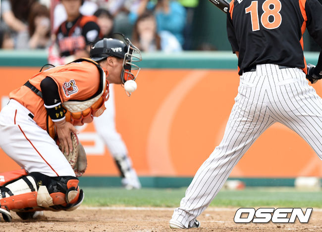 5회초 무사에서 한화 포수 조인성이 배영수의 바운드 투구를 맞고 있다.