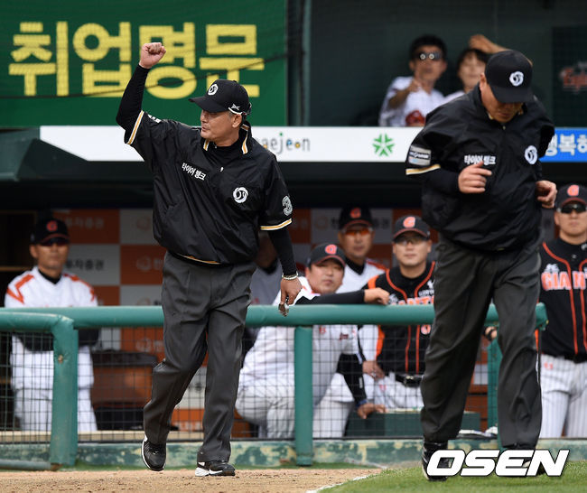 심판진이 합의판정을 통해 5회말 1사 1,2루에서 한화 김태균의 타구 관련 아웃을 선언하고 있다.