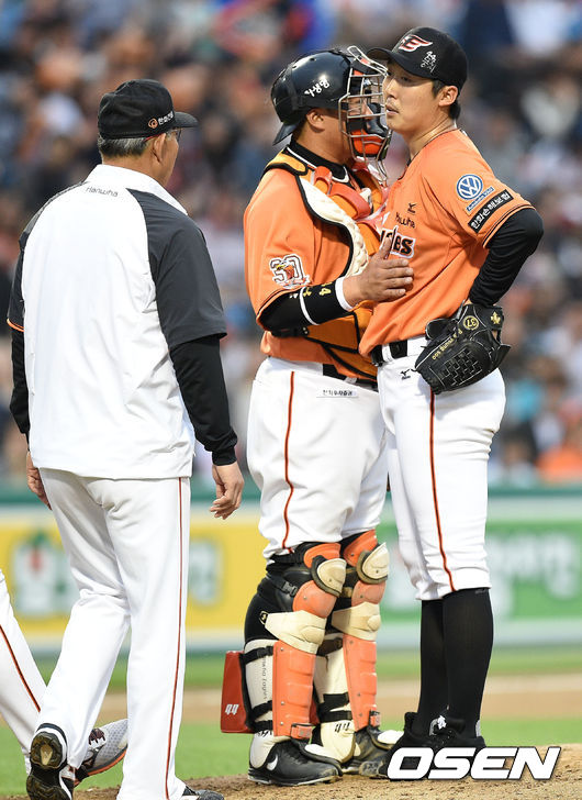 7회초 1사 1,2루에서 한화 조인성이 마운드를 내려가는 배영수를 격려하고 있다.
