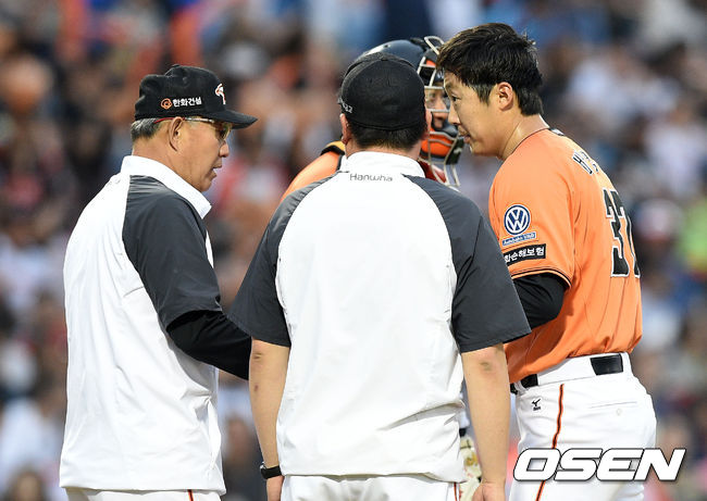 7회초 1사 1,2루에서 한화 배영수가 마운드를 내려가고 있다.