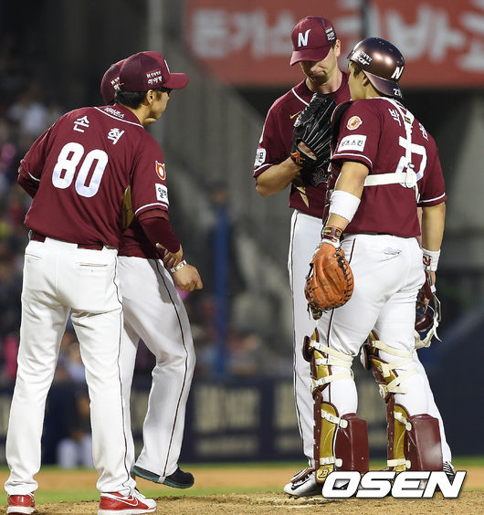 2일 오후 서울 잠실구장에서 열린 '2015 타이어뱅크 KBO 리그' LG 트윈스와 넥센 히어로즈의 경기 7회말 1사 1루, 밴헤켄이 손혁 코치-박동원과 이야기를 나누고 있다.