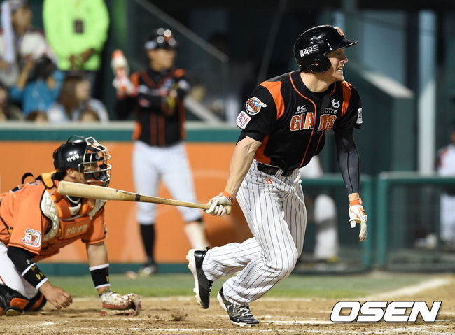8회초 무사에서 롯데 아두치가 좌중간 2루타를 치고 있다.