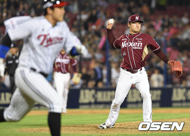 2일 오후 서울 잠실구장에서 열린 '2015 타이어뱅크 KBO 리그' LG 트윈스와 넥센 히어로즈의 경기 9회말 2사 1루 유강남을 땅볼로 처리하고 있다.