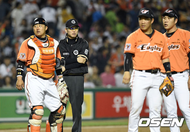 한화 선수들이 9회초 2사 1,3루에서 롯데 오승택의 포스 아웃 판정 관련 심판 합의 판정의 결과를 기다리고 있다./sunday@osen.co.kr