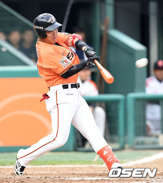 한화 2루수 정근우(33)는 지난 2일 대전 롯데전에서 시즌 첫 홈런손맛을 봤다. 4-0으로 리드한 3회 선두타자로 나와 롯데 브룩스 레일리의 초구 가운데 높은 144km 직구를 공략, 좌측 담장을 그대로 넘어가는 비거리 110m 솔로 홈런으로 장식했다. 시즌 9경기 34타석 만에 터진 시즌 1호 마수걸이 홈런.