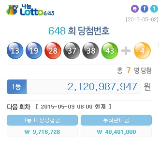 2일 나눔로또 추첨결과 제 648회 로또 1등 당첨 번호는 13, 19, 28, 37, 38, 43로 결정됐다. 2등 보너스 번호는 4번이다.