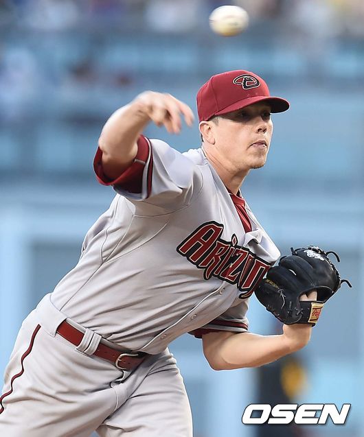 애리조나 선발 제레미 헬릭슨이 힘차게 공을 뿌리고 있다.