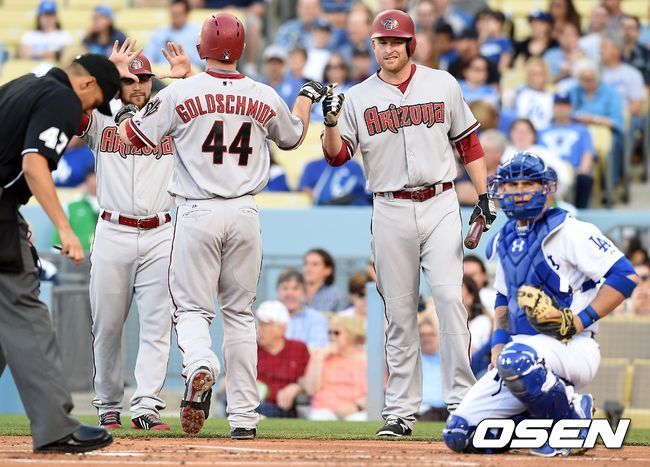 1회초 애리조나 공격 1사 2루 상황 폴 골드슈미트가 선제 중월 투런포를 날리고 홈을 밟으며 인시아르테-트럼보와 인사를 나누고 있다.