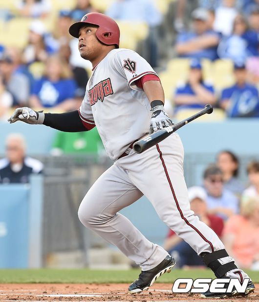 1회초 애리조나 공격 2사 주자없는 상황 야스마니 토마스가 좌익수 키를 넘기는 2루타를 날리고 있다.