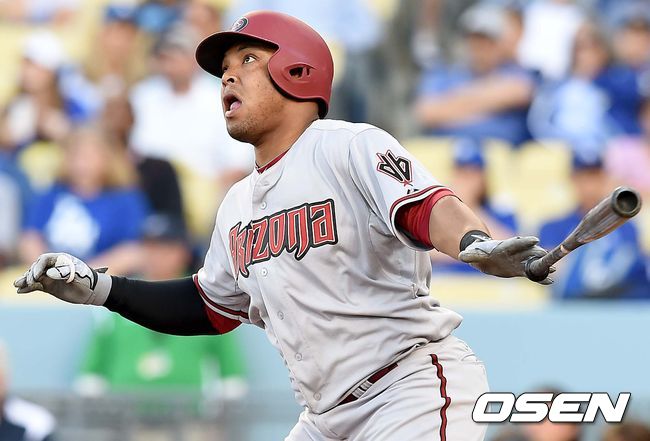 1회초 애리조나 공격 2사 주자없는 상황 야스마니 토마스가 좌익수 키를 넘기는 2루타를 날리고 있다.