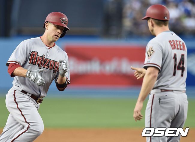 4회초 애리조나 공격 선두타자로 나선 아론 힐이 다시 앞서가는 좌월 솔로포를 날리고 그라운드를 돌고 있다.