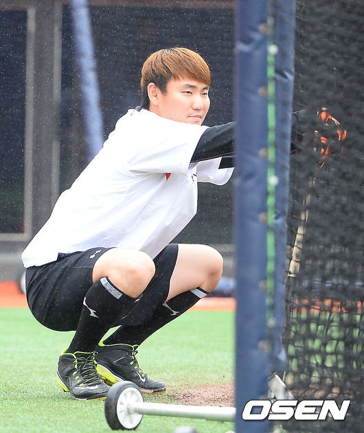 3일 오후 경기도 수원 kt위즈파크에서 '2015 타이어뱅크 KBO리그 kt 위즈와 NC 다이노스의 경기에 앞서, 장성우가 타격훈련을 지켜보고 있다.