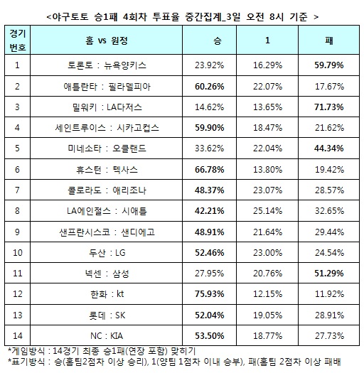 국민체육진흥공단(www.kspo.or.kr)이 발행하는 체육진흥투표권 공식 온라인 발매 사이트 베트맨(www.betman.co.kr)이 오는 5일에 벌어지는 미국프로야구(MLB) 9경기, 한국프로야구(KBO) 5경기 등 총 14경기를 대상으로 한 야구토토 승1패 4회차 투표율 중간집계 결과, 전체 참가자의 52.46%가 두산이 LG를 꺾을 것으로 내다봤다.