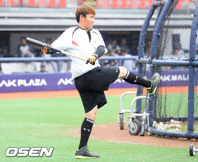3일 오후 경기도 수원 kt위즈파크에서 '2015 타이어뱅크 KBO리그 kt 위즈와 NC 다이노스의 경기에 앞서, 장성우가 스트레칭을 하고 있다.
