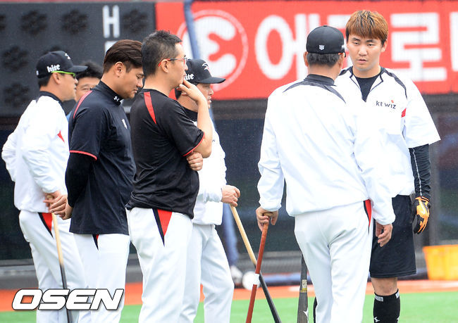 3일 오후 경기도 수원 kt위즈파크에서 '2015 타이어뱅크 KBO리그 kt 위즈와 NC 다이노스의 경기에 앞서, 이적생 장성우와 kt 코치들이 이야기를 나누고 있다.