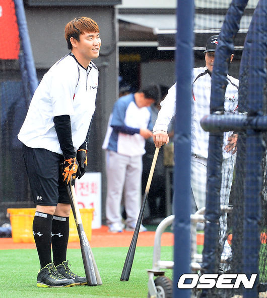 3일 오후 경기도 수원 kt위즈파크에서 '2015 타이어뱅크 KBO리그 kt 위즈와 NC 다이노스의 경기에 앞서, 장성우가 kt타격 훈련을 지켜보고 있다.