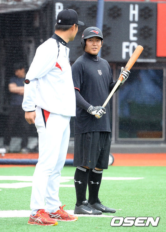 3일 오후 경기도 수원 kt위즈파크에서 '2015 타이어뱅크 KBO리그 kt 위즈와 NC 다이노스의 경기에 앞서, 하준호가 코치와 이야기를 나누고 있다.
