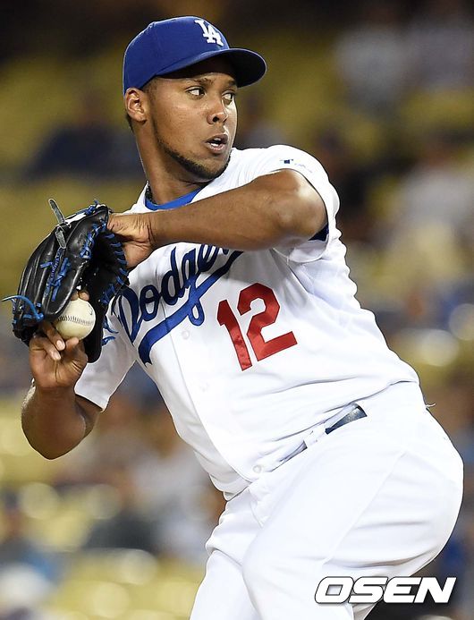 7회초 애리조나 공격 때 다저스 투수 후안 니카시오가 힘차게 공을 뿌리고 있다.