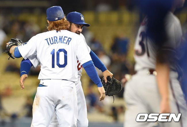 경기 종료 직후 다저스 1루수 곤살레스와 3루수 터너가 승리를 기뻐하고 있다./dreamer@osen.co.kr