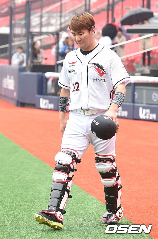 3일 오후 경기도 수원 kt위즈파크에서 '2015 타이어뱅크 KBO리그 kt 위즈와 NC 다이노스의 경기에 앞서, 장성우가 그라운드로 들어서고 있다.