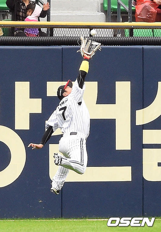 3일 오후 서울 잠실구장에서 열린 '2015 타이어뱅크 KBO 리그' LG 트윈스와 넥센 히어로즈의 경기 1회초 2사 김민성의 플라이볼을 이병규가 잡고 있다.