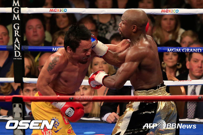 플로이드 메이웨더(미국)의 방패가 매니 파퀴아오(필리핀)의 창을 막아내며 '세기의 대결' 승자가 됐다. 파퀴아오와 메이웨더는 3일(한국시간) 미국 네바다 라스베가스 MGM 그랜드 가든 아레나서 정면 충돌했다. 메이웨더가 12라운드 판정 끝에 3명의 심판 전원 일치 판정승을 챙겼다.