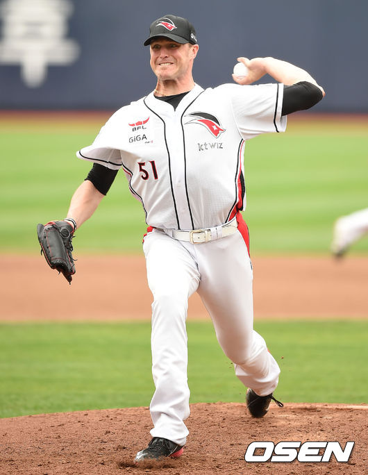 3일 오후 경기도 수원 kt위즈파크에서 '2015 타이어뱅크 KBO리그 kt 위즈와 NC 다이노스의 경기, 4회초 kt 시스코가 힘차게 공을 뿌리고 있다.