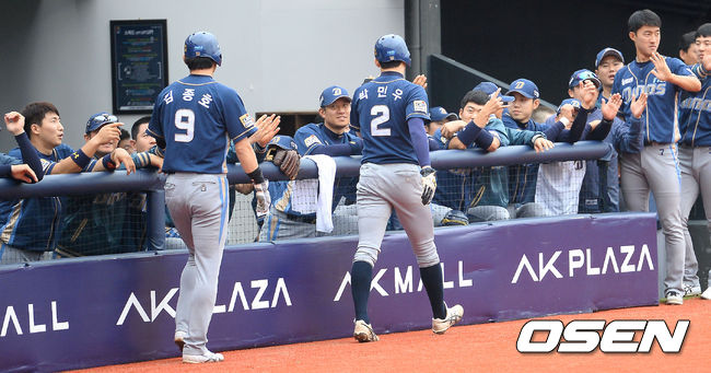 3일 오후 경기도 수원 kt위즈파크에서 '2015 타이어뱅크 KBO리그 kt 위즈와 NC 다이노스의 경기, 4회초 2사 2,3루 테임즈의 2타점 적시타로 홈을 밟은 NC 김종호와 박민우가 동료들과 인사를 나누고 있다.