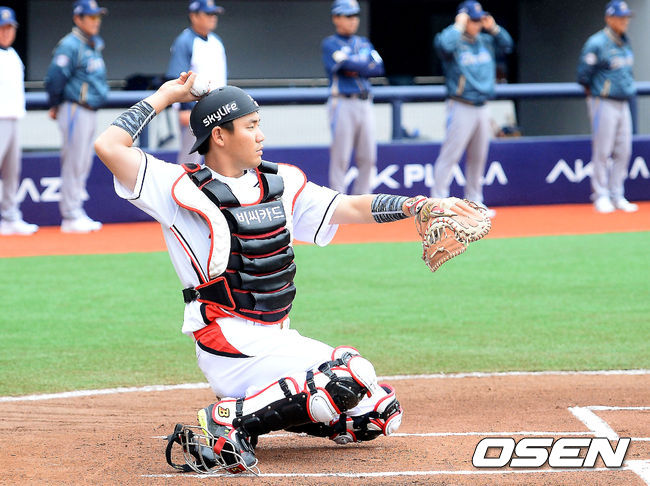 3일 오후 경기도 수원 kt위즈파크에서 열린 '2015 타이어뱅크 KBO리그 kt 위즈와 NC 다이노스의 경기에 앞서 kt로 이적한 장성우가 선발 엄상백과 호흡을 맞추고 있다.