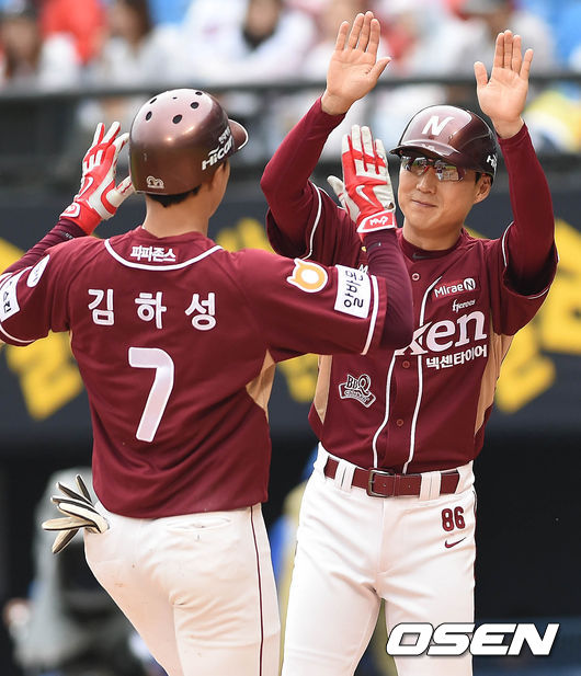 3일 오후 서울 잠실구장에서 열린 '2015 타이어뱅크 KBO 리그' LG 트윈스와 넥센 히어로즈의 경기 6회초 선두타자 김하성이 솔로홈런을 치고 홈에서 정수성 코치와 하이파이브를 하고 있다.