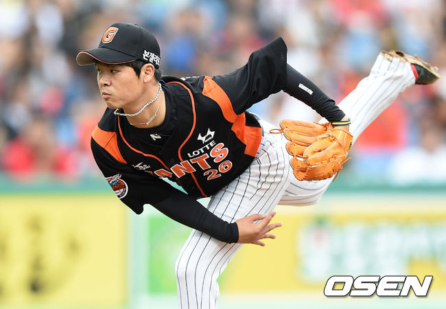 5회말 무사에서 롯데 이성민이 힘차게 공을 던지고 있다.