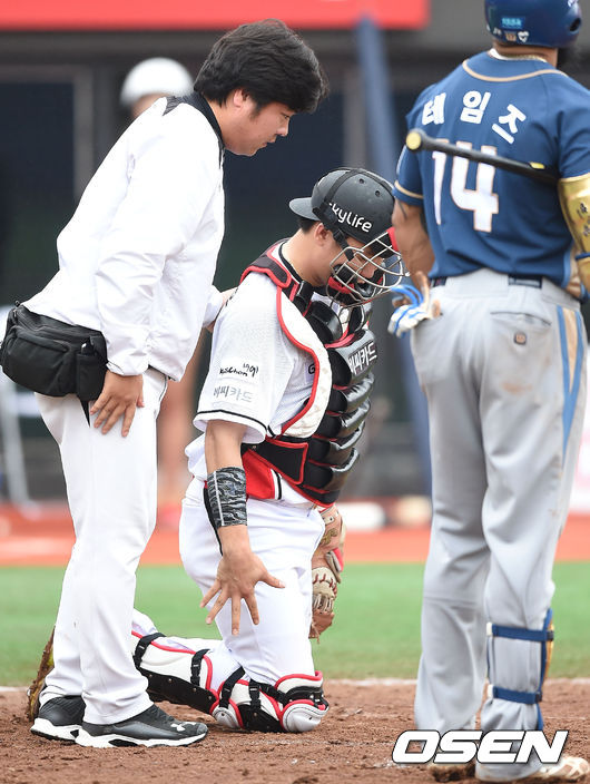 3일 오후 경기도 수원 kt위즈파크에서 열린 '2015 타이어뱅크 KBO리그 kt 위즈와 NC 다이노스의 경기, 7회초 무사 만루상황에서 손가락 부상을 당한 kt 포수 장성우가 스텝과 손가락을 살피고 있다.