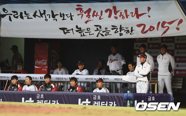 3일 오후 서울 잠실구장에서 열린 '2015 타이어뱅크 KBO 리그' LG 트윈스와 넥센 히어로즈의 경기 9회초 LG 선수들이 경기를 지켜보고 있다.
