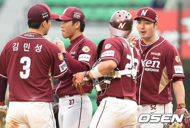 3일 오후 서울 잠실구장에서 열린 '2015 타이어뱅크 KBO 리그' LG 트윈스와 넥센 히어로즈의 경기 종료 후 넥센 선수들이 하이파이브를 하고 있다.